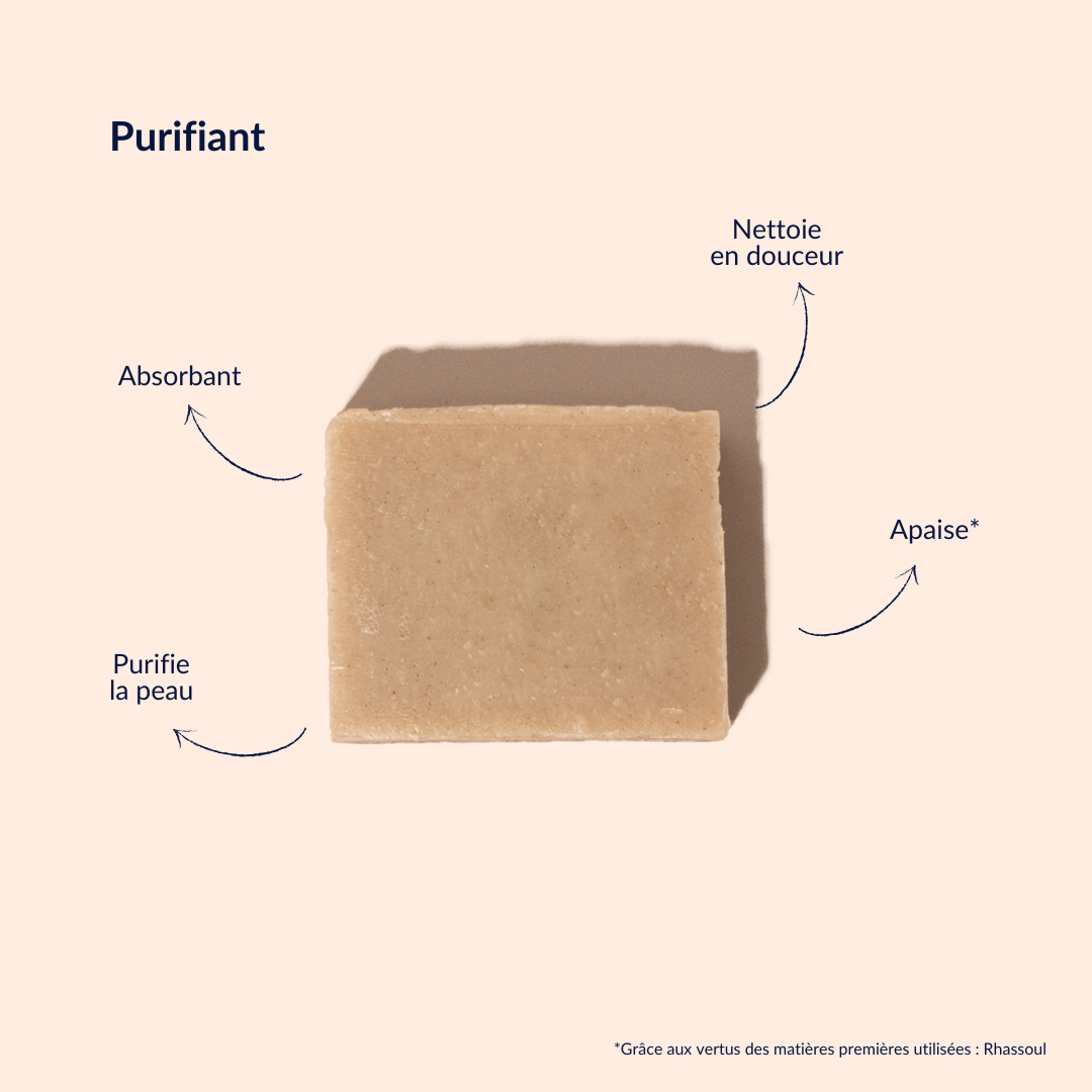 Le Purifiant - Savon/Shampoing Rhassoul Purifiant Bio offre une expérience de soin complète, en apportant les bienfaits purifiants du rhassoul à la fois à la peau et aux cheveux.